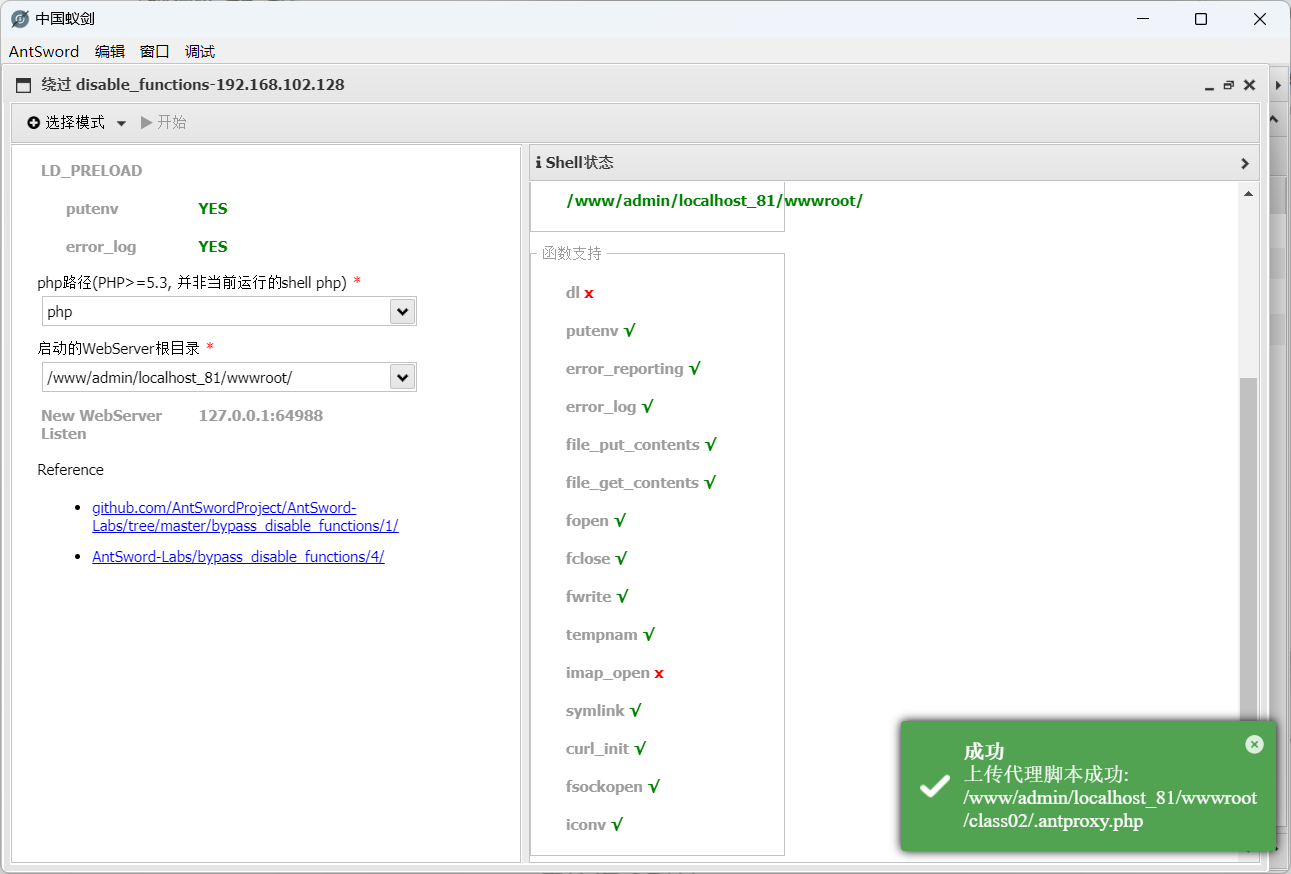 蚁剑链接.antproxy.php文件,即可成功执行命令,在虚拟终端中利用tac /flag即可读取